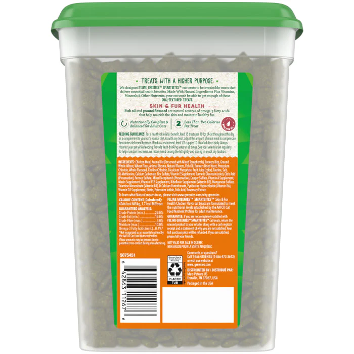 FELINE GREENIES SMARTBITES Skin & Fur Treats for Cats are the perfect treat to keep your cat purring. Designed by veterinarians with fish oil that provides a rich, natural source of omega-3 fatty acids, as well as ground flaxseed, these healthy cat treats help maintain healthy skin and fur. These delicious vet recommended cat snacks have added vitamins, minerals, and other nutrients for a nutritionally complete and balanced snack. Plus, the irresistible little treats come in a delectable chicken flavor and have a delightful crunchy and soft dual-texture. These FELINE GREENIES are tasty skin and fur treats your adult cat will love. They're also the perfect sized treats for cat toys... try placing a few inside a treat dispenser toy and watch your cat chase and swat away. Share with all the felines in your life and give them FELINE GREENIES SMARTBITES Skin & Fur Treats for healthy, happy purrs of joy.
