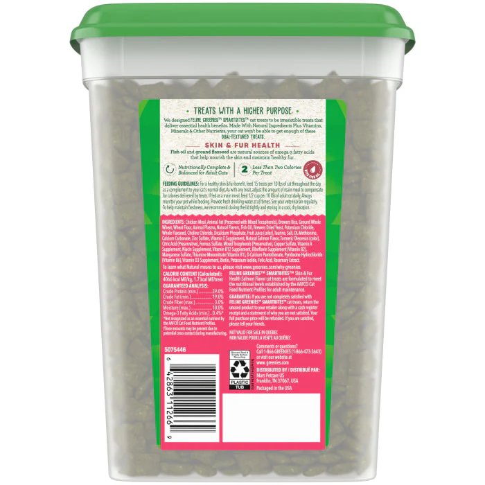 FELINE GREENIES SMARTBITES Skin & Fur Treats for Cats are the perfect treat to keep your cat purring. Designed by veterinarians with fish oil that provides a rich, natural source of omega-3 fatty acids, as well as ground flaxseed, these healthy cat treats help maintain healthy skin and fur. These delicious vet recommended cat snacks have added vitamins, minerals, and other nutrients for a nutritionally complete and balanced snack. Plus, the irresistible little treats come in a delectable salmon flavor and have a delightful crunchy and soft dual-texture. These FELINE GREENIES are tasty skin and fur treats your adult cat will love. They're also the perfect sized treats for cat toys... try placing a few inside a treat dispenser toy and watch your cat chase and swat away. Share with all the felines in your life and give them FELINE GREENIES SMARTBITES Skin & Fur Treats for healthy, happy purrs of joy.