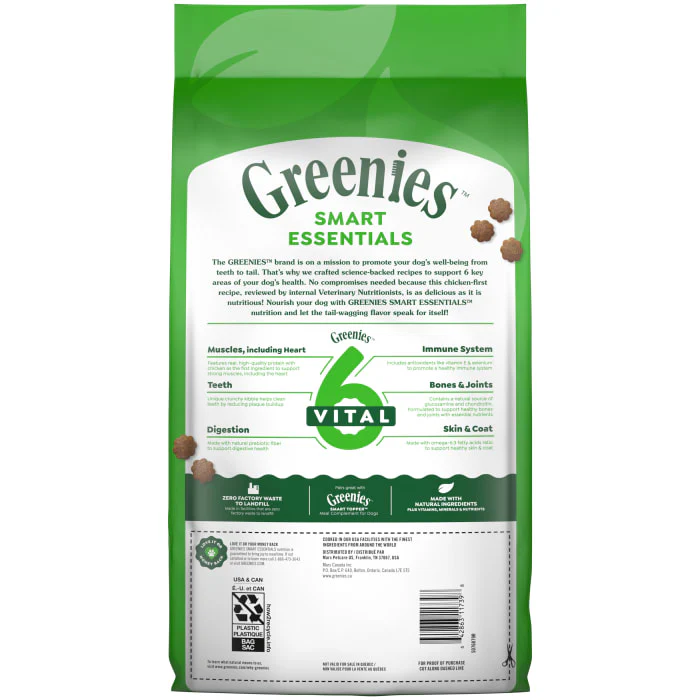 The Greenies brand is on a mission to promote your dog’s well-being from teeth to tail! Greenies Smart Essentials Adult High Protein Dry Dog Food Real Chicken & Rice Recipe offers science-backed nutrition with an irresistible taste. This nutritious dog food recipe features real chicken as the #1 ingredient and is designed to help support 6 key areas of your dog’s health: digestion, immune system, teeth, skin & coat, bones & joints, and muscles, including the heart. Greenies Smart Essentials Adult Dry Dog Food is formulated without corn, wheat, soy, or chicken by-product meal and no artificial flavors or preservatives*. Made with natural ingredients plus vitamins, minerals, and nutrients, Greenies Smart Essentials Adult High Protein Dry Dog Food is guaranteed to bring joy to mealtime with tail-wagging flavor. Love it or your money back! *Trace amounts may be present due to potential cross-contact during manufacturing