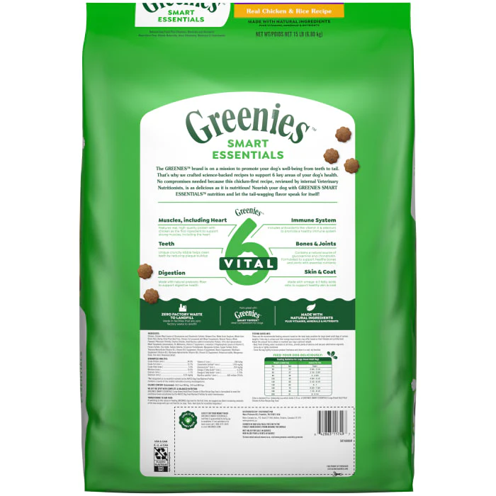 The Greenies brand is on a mission to promote your dog’s well-being from teeth to tail! Greenies Smart Essentials Adult Large Breed High Protein Dry Dog Food Real Chicken & Rice Recipe offers science-backed nutrition with an irresistible taste. This nutritious dry dog food for large breed adult dogs features real chicken as the #1 ingredient and is designed to help support 6 key areas of your dog’s health: digestion, immune system, teeth, skin & coat, bones & joints, and muscles, including the heart. Greenies Smart Essentials Adult Large Breed Dry Dog Food is formulated without corn, wheat, soy, or chicken by-product meal, and no artificial flavors or preservatives*. With a natural source of glucosamine and chondroitin and made with natural ingredients plus vitamins, minerals, and nutrients, Greenies Smart Essentials Adult Large Breed High Protein Dry Dog Food is guaranteed to bring joy to mealtime with tail-wagging flavor. Love it or your money back!