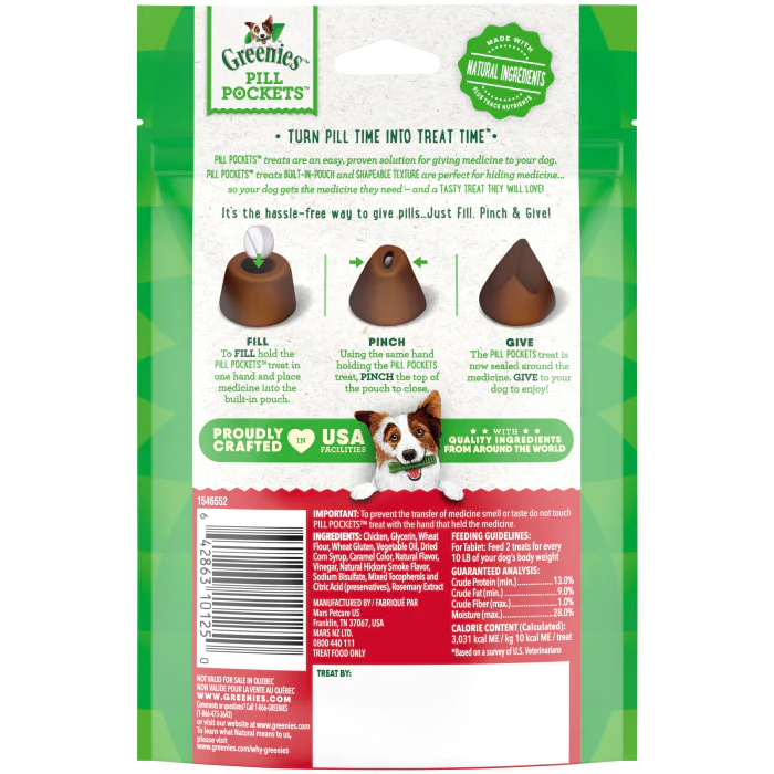 Turn pill time into treat time! Greenies Pill Pockets Treats are the #1 veterinarian-recommended choice for giving pills, based on a survey of US Veterinarians. Why hide your pet’s medicine in human foods like peanut butter or cheese when you can give them a dog treat made with natural ingredients plus minerals and trace nutrients? Greenies Pill Pockets Hickory Smoke Flavor Dog Treats are made with real chicken and take the hassle out of giving your canine companion medicine. Whether for large breeds or small dogs, these small-sized tablet Pill Pockets make taking medicine a positive experience for your dog. And they’re easy to give: Drop a tablet into the small Pill Pocket dog treat, pinch the top to close, give it to your dog, and watch their medicine disappear. Greenies Pill Pockets dog treats are the easy way to give your dog their meds—and they’ll never know the difference.