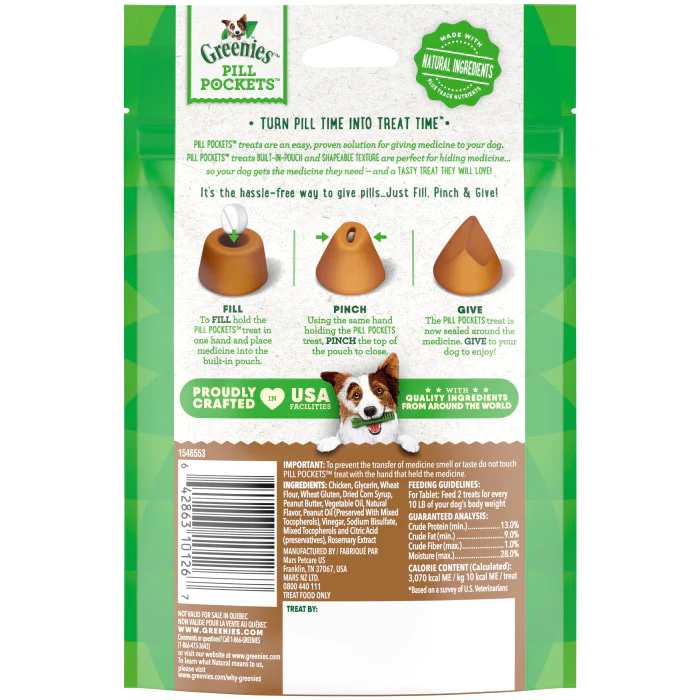 Turn pill time into treat time! Greenies Pill Pockets Treats are the #1 veterinarian-recommended choice for giving pills, based on a survey of US Veterinarians. Why hide your pet’s medicine in human foods like peanut butter or cheese when you can give them a dog treat made with natural ingredients plus minerals and trace nutrients? Greenies Pill Pockets Real Peanut Butter Flavor Dog Treats are made with real peanut butter and take the hassle out of giving your canine companion medicine. Whether for large breeds or small dogs, these small-sized tablets Pill Pockets make taking medicine a positive experience for your dog. And they’re easy to give: Drop a tablet into the small Pill Pocket dog treat, pinch the top to close, give it to your dog, and watch their medicine disappear. Greenies Pill Pockets dog treats are the easy way to give your dog their meds—and they’ll never know the difference.