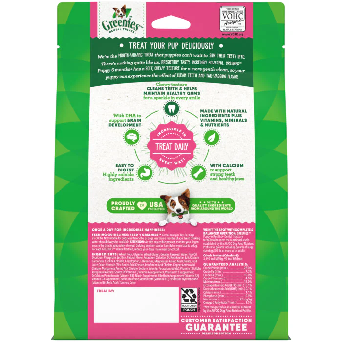 Start your puppy off with a healthy habit by making GREENIES Puppy (6 months and up) Dental Treats a part of their oral care routine. These irresistibly tasty dental treats are easy-to-digest, clean teeth, and have a soft, chewy texture for a more gentle clean. Plus, these teeth-cleaning treats for puppies 25-50 lbs. support healthy development with DHA and calcium. These dental chews for puppies are proudly crafted in USA facilities with quality ingredients from around the world. Celebrate your favorite puppy with these mouth-wowing, teeth-cleaning, GREENIES Dental Treats for puppies for a sparkle in every smile.