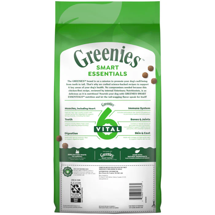 The Greenies brand is on a mission to promote your dog’s well-being from teeth to tail! Greenies Smart Essentials Small Breed Adult High Protein Dry Dog Food Real Chicken & Rice Recipe offers science-backed nutrition with an irresistible taste. This nutritious dog food recipe features real chicken as the #1 ingredient and is designed to help support 6 key areas of your dog’s health: digestion, immune system, teeth, skin & coat, bones & joints, and muscles, including the heart. Greenies Smart Essentials Small Breed Adult Dry Dog Food is formulated without corn, wheat, soy, or chicken by-product meal and no artificial flavors or preservatives*. Made with natural ingredients plus vitamins, minerals, and nutrients, GREENIES Smart Essentials Small Breed Adult High Protein Dry Dog Food is guaranteed to bring joy to mealtime with tail-wagging flavor. Love it or your money back! *Trace amounts may be present due to potential cross-contact during manufacturing