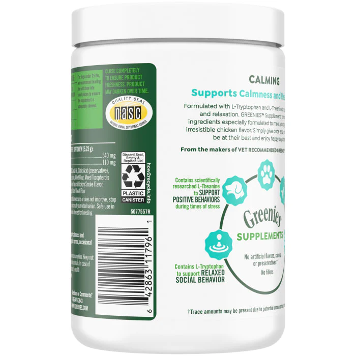 From the makers of vet recommended GREENIES Dental Treats, you can provide calming support to your furry friend with GREENIES Calming Supplements. These supplements are formulated with L-Tryptophan and L-Theanine to support calmness and relaxation as well as support positive behavior during times of normal and occasional stress. GREENIES Calming Supplements are also crafted with real chicken for irresistible taste and no artificial flavors, preservatives, or colors*. Made in the USA with quality ingredients from around the world, formulated by a team of PH.D animal nutritionists, and contains the National Animal Supplement Council Quality Seal, you can be sure you’re giving your canine companion a quality supplement they will love. (*Trace amounts may be present due to potential cross-contact during manufacturing)